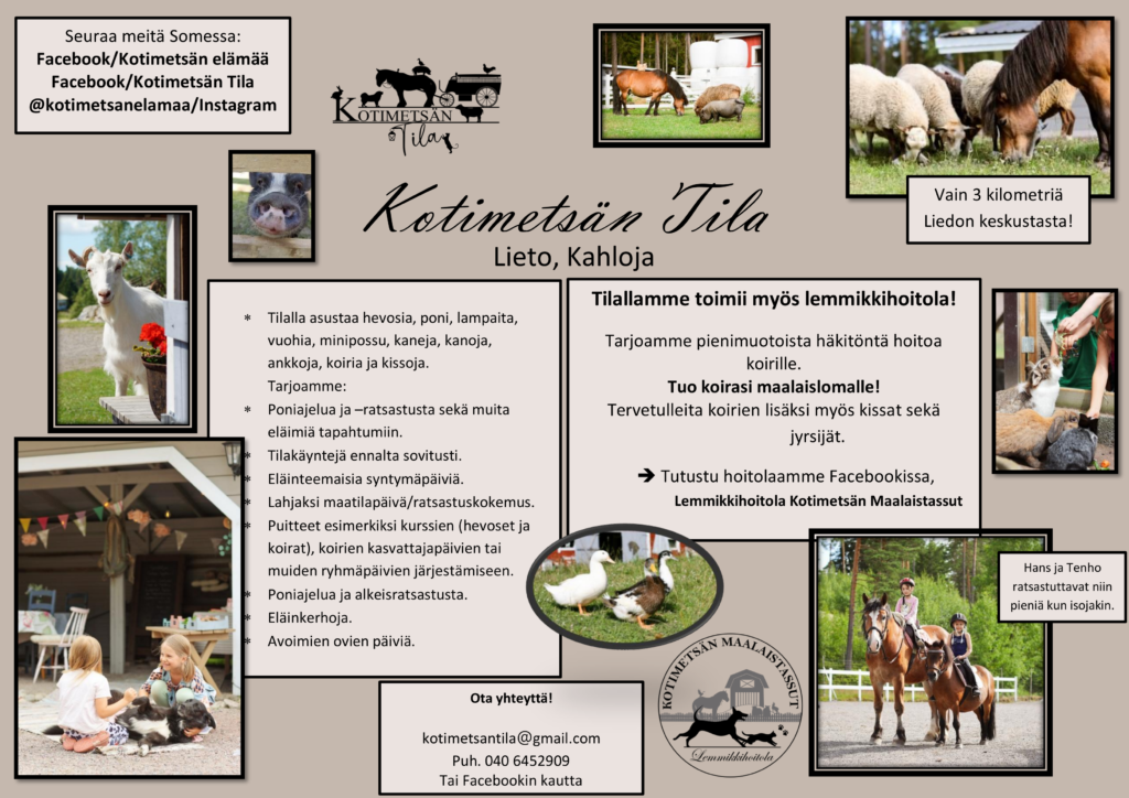 Tutustu alapuolella Kotimetsän Tilan tarjoamiin palveluihin. Älä epäröi ottaa yhteyttä jos herää kysyttävää!
